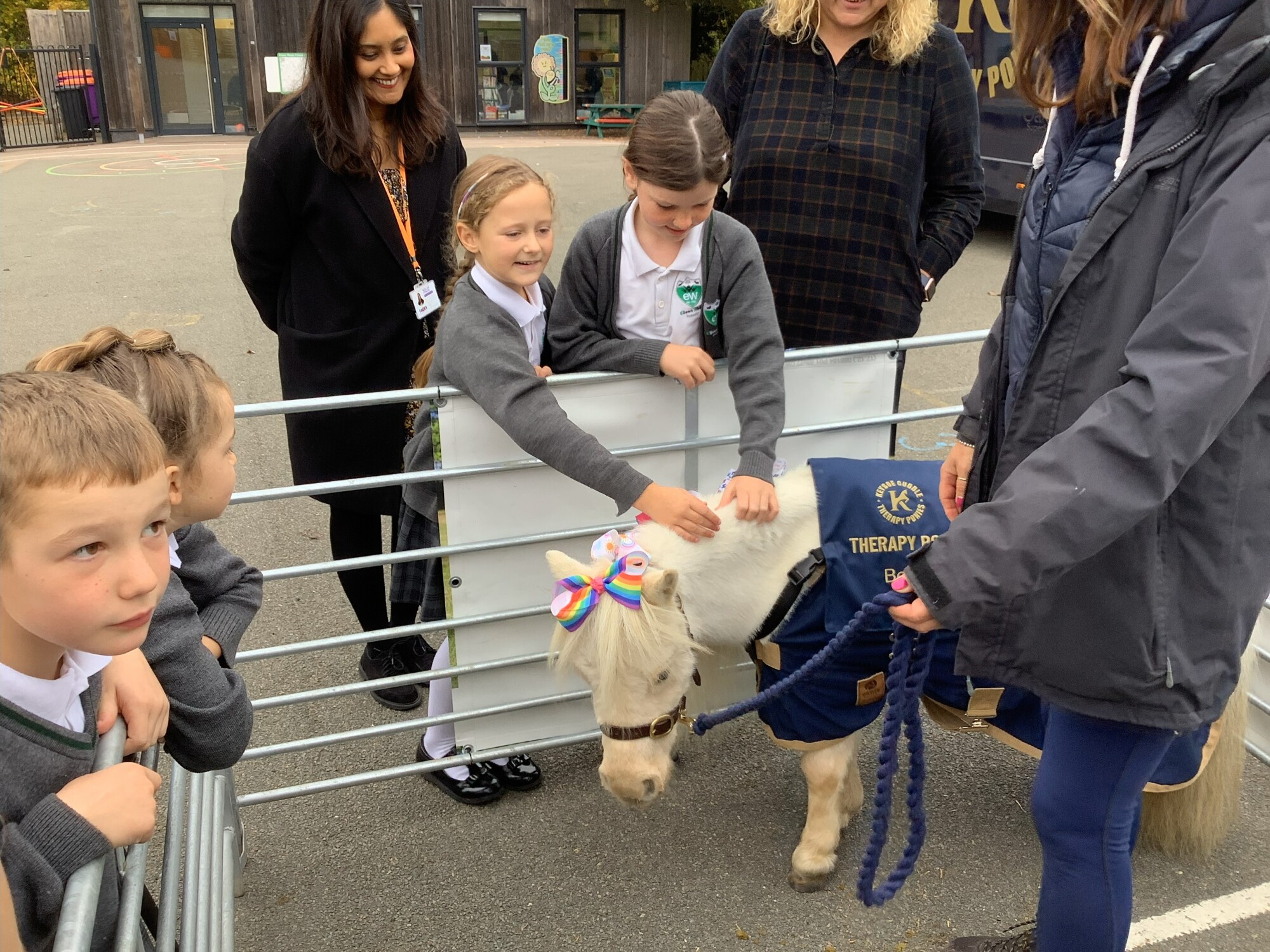 The school were visited by a couple of therapy ponies from Keysoe. The gentle animals are trained to provide emotional supportand a sense of wellbeing. The children visited them in groups and were able to stroke the ponies.